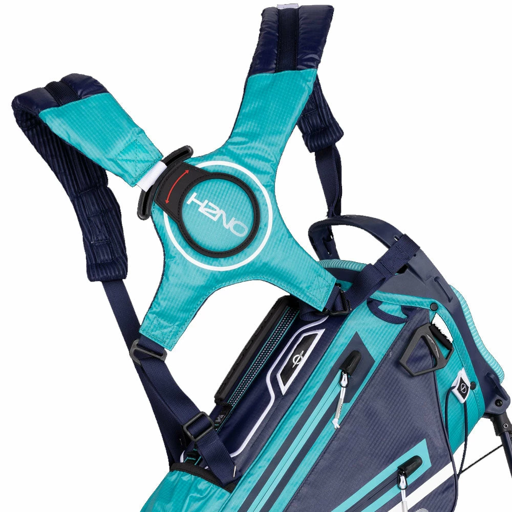 The bag has an E-Z dual lite strap system which is easy to get on and off and a lift assist handle built into the lower spine pocket. The top mounted patented roller bottom leg mechanism keeps the bag in place as you take your shot. The new comfort hip pad provides additional stability as you move around the course.
